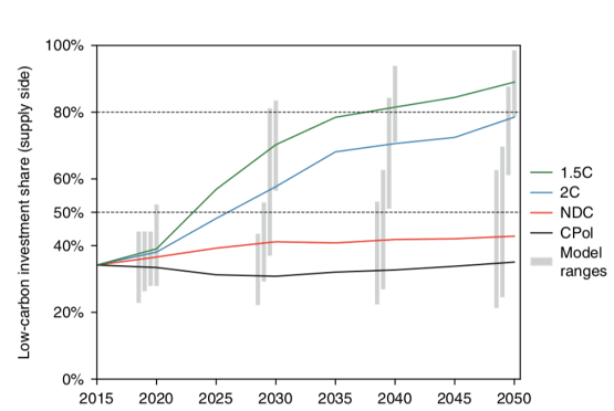 預測全球平均年度投資途徑以滿足1.5C(綠色),2C(藍色)和NDC(紅色)目標以及“一切照舊”情景(CPol;黑色)。供應方投資中的價值占供應方總投資的比例。因此,這些價值不包括能效投資。資料來源:McCollum,DL et al。(2018年)