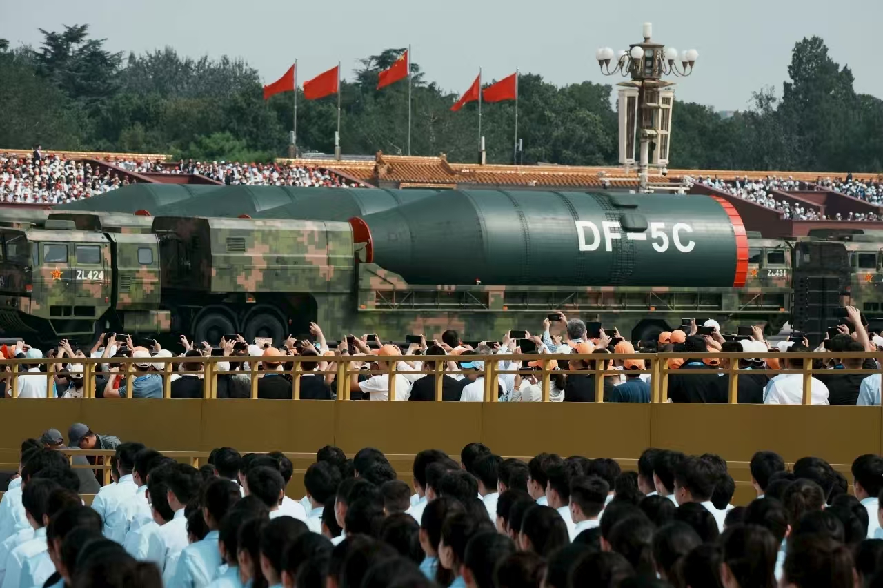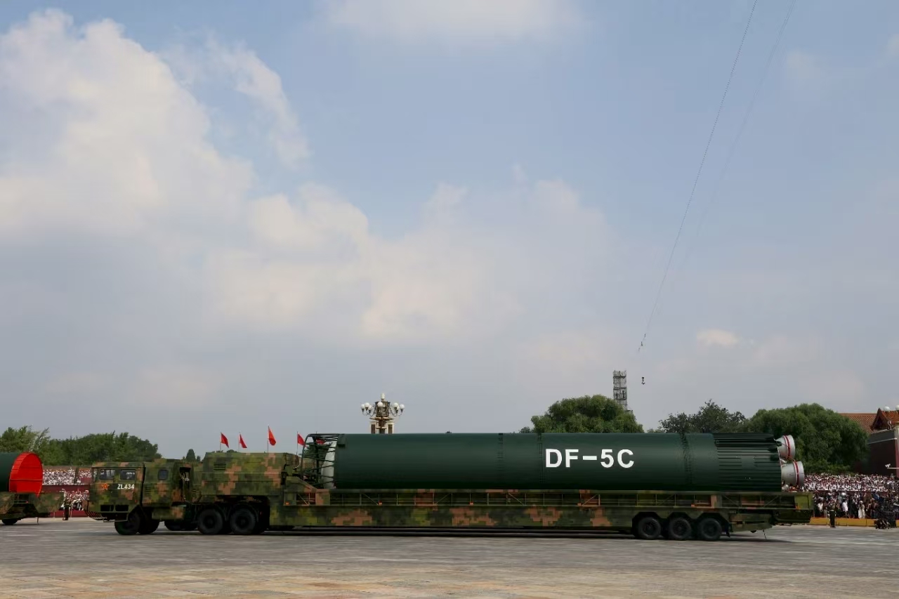 12臺大型導(dǎo)彈運輸車載著“東風(fēng)-5C”液體洲際戰(zhàn)略核導(dǎo)彈浩蕩而來。核導(dǎo)彈第二方隊是裝備方隊壓軸出場的方隊。“東風(fēng)-5C”液體洲際戰(zhàn)略核導(dǎo)彈是我國戰(zhàn)略反擊體系中的重要組成,打擊范圍覆蓋全球,全時戒備、有效威懾,以武止戈、砥定乾坤。方隊由火箭軍某基地牽頭抽組。