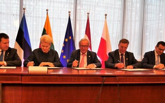 愛沙尼亞,拉脫維亞,立陶宛,波蘭和歐盟委員會主席讓 - 克洛德·容克等領(lǐng)導(dǎo)人周四在布魯塞爾簽署了同步協(xié)議。2018年6月28日。 資料來源:( Triin Oppi /政府辦公室)
