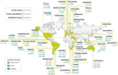看看地圖(你可以在下面看到它放大)。雖然西班牙的可再生能源公司已經(jīng)能夠征服全球市場(chǎng),很少能展示自己在許多國(guó)家簽署五大洲的Renovagy,已經(jīng)增加了項(xiàng)目超過(guò)600萬(wàn)千瓦,這可能在一倍接下來(lái)的幾年。西班牙技術(shù)正在改變光伏太陽(yáng)能,將其轉(zhuǎn)變?yōu)榈谝荒茉础?/p>