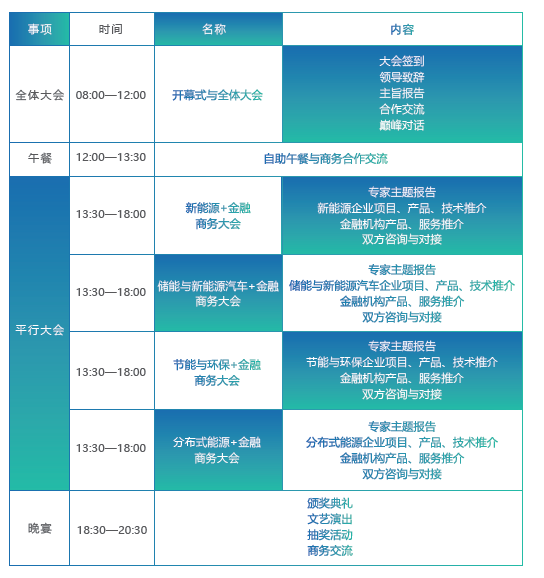 打破常規(guī),創(chuàng)新融合,是“能金會(huì)”一大特色。資料顯示,第二界“能金會(huì)”共分三大板塊,一是“開(kāi)幕式與全體大會(huì)”,二是“平行大會(huì)”,三是“晚宴”,主題清晰、層次分明,而不失“有料”、“有溫度”。其中,“平行大會(huì)”分為“新能源+金融商務(wù)大會(huì)”、“儲(chǔ)能與新能源汽車(chē)+金融商務(wù)大會(huì)”、“節(jié)能與環(huán)保+金融商務(wù)大會(huì)”和“分布式能源+金融商務(wù)大會(huì)”四個(gè)單元,每個(gè)單元分別設(shè)置了專家主題報(bào)告、相關(guān)企業(yè)項(xiàng)目、產(chǎn)品技術(shù)推介、金融機(jī)構(gòu)產(chǎn)品、服務(wù)推介、和雙方咨詢與對(duì)接等環(huán)節(jié),將能源與金融業(yè)之間的無(wú)縫對(duì)接落到了實(shí)處。