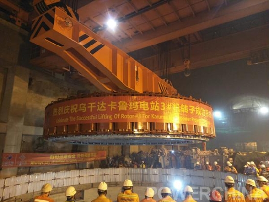 卡魯瑪水電站共設(shè)6臺套額定容量為額定功率為100MW(最大功率110MW)的發(fā)電機(jī),其發(fā)電機(jī)轉(zhuǎn)子包括中心體、支架、磁軛、磁極和制動環(huán),整個轉(zhuǎn)子組裝在卡魯瑪?shù)叵露词野惭b間完成。轉(zhuǎn)子最大高度1.842米,最大直徑9.350米,包含轉(zhuǎn)子起吊工具重達(dá)350噸,其結(jié)構(gòu)具有足夠的強(qiáng)度和剛度,采用無風(fēng)扇結(jié)構(gòu)并具有結(jié)構(gòu)合理、緊湊及良好的電磁、通風(fēng)性能。