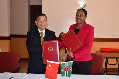2018年7月13日,駐多米尼克大使盧坤與多外交部長巴倫分別代表兩國政府簽署《中華人民共和國政府與多米尼克政府關(guān)于共同推進(jìn)絲綢之路經(jīng)濟(jì)帶與21世紀(jì)海上絲綢之路建設(shè)的諒解備忘錄》。