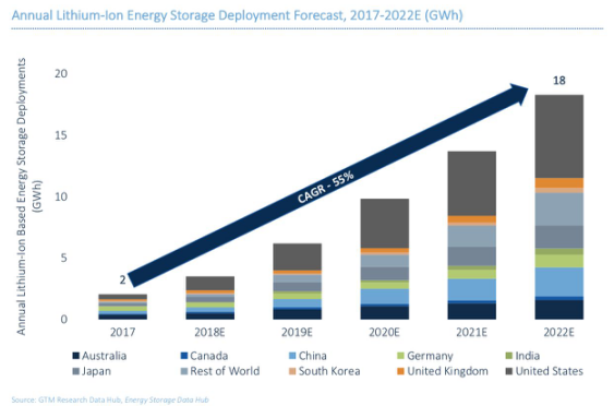 這種增長從一個規(guī)模很小的基礎(chǔ)上開始的,相比之下,電動汽車銷售僅在2017年就產(chǎn)生了112千兆瓦時的電池需求。然而,隨著年增長率達(dá)到55%,電網(wǎng)級儲能系統(tǒng)將足以提高和改變?nèi)螂姎庀到y(tǒng)的性能。