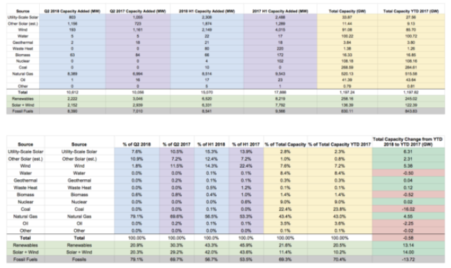 在2018年上半年,這些數(shù)字更好,但仍不如2017年那么好??稍偕茉凑荚搰略鲭娏θ萘康?3%,低于2017年上半年的46%。(Solar +)風(fēng)力占全國新增電力容量的42%,低于2017年上半年的44%。)