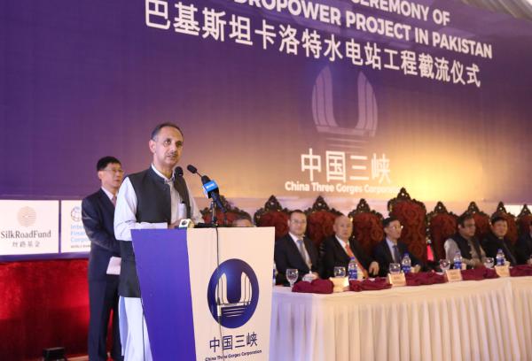 9月22日,在巴基斯坦旁遮普省卡洛特地區(qū),巴基斯坦能源部長奧馬爾·阿尤布·汗在卡洛特水電站項(xiàng)目截流儀式上致辭。 新華社記者劉天攝