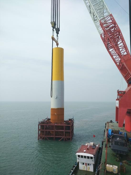 三峽新能源江蘇大豐300MW海上風電項目離岸直線距離約45km,泥面高程在-1.0m~-17.0m之間,風電場共安裝54臺3.3MW和19臺6.45MW風電機組,總裝機規(guī)模300MW,其中6.45MW單樁基礎直徑最大8m,樁重最大約1153t,樁長最長87m。