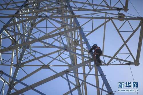 在五家渠750千伏變電站220千伏送出工程施工現(xiàn)場(chǎng),工作人員在攀爬電力塔架(9月30日攝)。