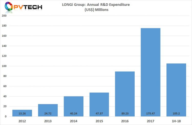 根據(jù)PV Tech對主要光伏制造商研發(fā)支出趨勢的年度分析,LONGi集團(tuán)是2017年最大的消費(fèi)者,超過1.75億美元的研發(fā)活動。該公司已于2018年在研發(fā)活動上花費(fèi)超過1.05億美元。