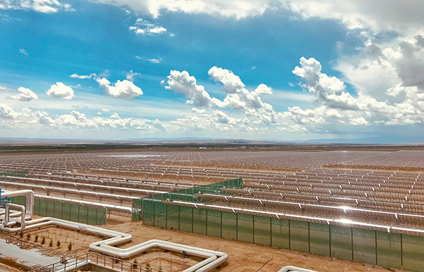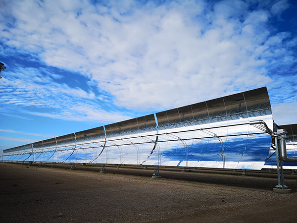 據(jù)了解,中廣核德令哈光熱示范項目采用槽式導熱油集熱技術(shù)路線,配套9小時熔融鹽儲熱,由太陽島、熱傳及蒸汽發(fā)生系統(tǒng)、儲熱島、發(fā)電島四大部分組成。其中,太陽島集熱器由25萬片共62萬平方米的反光鏡、11萬米長的真空集熱管、跟蹤驅(qū)動裝置等組成,場面浩大、蔚為壯觀。它們就像向日葵一樣,可以跟蹤太陽的轉(zhuǎn)動,把熱量源源不斷地收集起來。而佇立在儲熱島的熔融鹽儲罐,直徑達42米,是亞洲最大的熔融鹽儲熱罐。