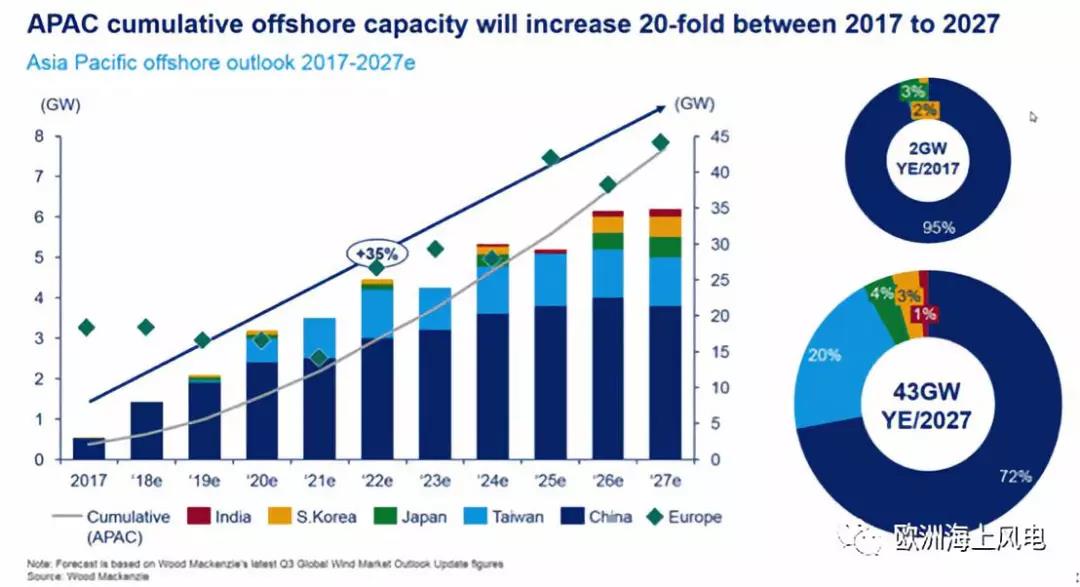 其實(shí),他的結(jié)論來自MAKE的一份調(diào)查研究報(bào)告。據(jù)這份報(bào)告指出,到2027年,亞太地區(qū)的海上風(fēng)電容量將會(huì)增長(zhǎng)20倍,達(dá)到43GW,光中國(guó)每年平均就能接近4GW。