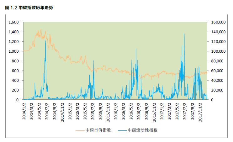 為了全面呈現(xiàn)試點碳市場(重慶碳市場由于交投樣本過低未納入統(tǒng)計)的碳價走勢及交易活躍程度,北京綠色金融協(xié)會2014年推出了中碳指數(shù),包括市值指數(shù)和流動性指數(shù)兩只指數(shù)1。2017交易年度,市值指數(shù)走勢相對平穩(wěn),基本維持在400點至600點區(qū)間震蕩,全年最高點為601.25點,最低點為433.68點,顯示2017年試點碳市場的配額價格已經(jīng)止跌趨穩(wěn),和2016交易年度基本持平,與2014和2015交易年度的碳價持續(xù)下跌形成鮮明對照。而流動性指數(shù)則繼續(xù)呈現(xiàn)出明顯的“階段效應”,在履約期集中的5、6、7月交易異?;钴S,而在履約期結束后指數(shù)快速下跌;后在全國碳市場消息較為頻繁的9、10月,市場交易再度活躍。