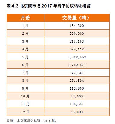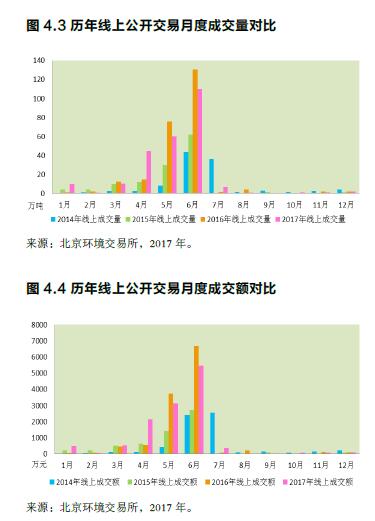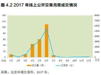 自2013年11月28日開市至2017年12月31日,北京碳市場累計成交配額2013萬噸,交易額7.11億元。其中線上公開成交727萬噸,交易額3.64億元;線下協(xié)議轉讓成交1286萬噸,交易額3.47億元。