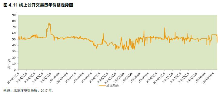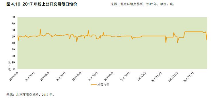 價格走勢。2017年度北京碳市場首個交易日的公開交易成交均價為51.36元/噸,最后一個交易日的公開交易成交均價為54.00元/噸,全年公開交易的成交均價為49.95元/噸。最高單日成交均價為61.60元/噸(2月15日),最低單日成交均價為40.6元/噸(11月3日)。單筆交易成交價最高為71.80元/噸(5月18日),最低為33.90元/噸(4月26日)。從線上公開交易價格走勢看,2017年履約期間,市場價格在相對高位波動較為頻繁,市場價格中樞維持在50元/噸左右;隨著履約期的結束,成交量開始下降,市場價格波動也有所減緩。7月份之后,配額價格基本穩(wěn)定在40-60元/噸區(qū)間。