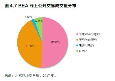 2017年,北京碳市場線上公開交易月度成交仍然主要集中在履約期期間。隨著重點排放單位于3月陸續(xù)完成排放報告編制工作,基本確定市場表現(xiàn)自身配額需求,市場開始進入活躍期,交易量逐月提高。3、4月份市場開始預熱,進入5、6月份線上成交量迅猛增長,占全年線上成交量的68.83%,成交額占69.36%。隨著市場逐步成熟穩(wěn)定,2017年較2016年相比配額線上總體交易情況相差不大,但因履約期市場供需的共同釋放仍集中于5-6月份。雖然經(jīng)過前三年試點,重點排放單位履約意識不斷加強,但多數(shù)受限于自身業(yè)務結構,靈活運用碳資產(chǎn)的經(jīng)驗仍然不足,大多在5月履約工作啟動后才開始入市購買配額,導致在6月履約進入沖刺階段后累積了大量剛性需求,帶動市場交易量在履約期間快速增長。市場參與情況。截至2017年12月31日,北京碳市場累計申請開戶逾947家,其中履約機構仍占絕大多數(shù)。與去年相比,2017年新增開戶企業(yè)主要為CCER投資機構。全年的BEA線上公開交易中,共有近500家機構和自然人參與過交易。其中,履約機構與履約機構之間的交易占總筆數(shù)的1.80%,占總成交量的1.86%,較去年均有明顯降低;履約機構與非履約機構之間的交易占總筆數(shù)的48.88%,較去年有小幅增長,占總成交量的41.85%,較去年有小幅降低;非履約機構之間的交易占總筆數(shù)的42.47%,占總成交量的50.84%,較去年均有明顯增長;自然人參與的交易占總筆數(shù)的6.85%,占總成交量的5.44%,較去年均有小幅降低。根據(jù)市場參與情況,非履約機構參與的交易呈明顯增長趨勢,不難看出非履約機構在活躍市場氛圍、增強市場流動性等方面發(fā)揮了重要的作用。