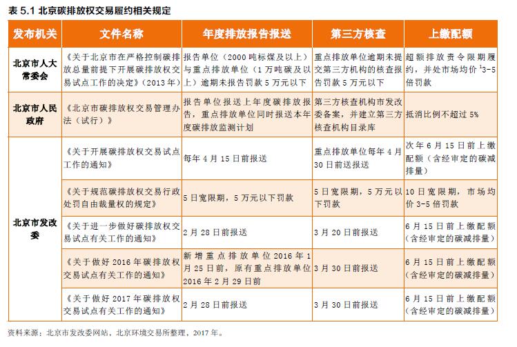 地方規(guī)范性文件。2016年12月,北京市發(fā)改委印發(fā)《關于做好2017年碳排放權交易試點有關工作的通知》,對947家重點排放單位和582家一般報告單位的碳交易履約工作提出具體工作部署,要求重點排放單位應于2016年6月15日前,向注冊登記系統(tǒng)開設的配額賬戶上繳與其經(jīng)核查的2016年度排放總量相等的排放配額?! ?/p>