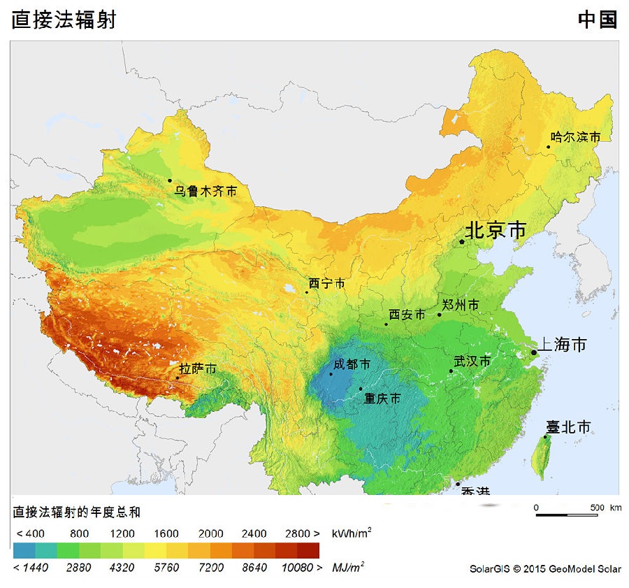 圖:中國(guó)太陽(yáng)直接法向輻射DNI分布(Solargis)