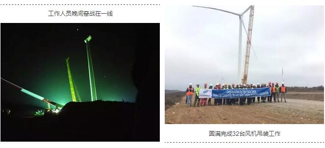 在集團(tuán)公司指導(dǎo)下,海外公司與太平洋水電團(tuán)隊(duì)精心組織管理,與項(xiàng)目管理團(tuán)隊(duì)及風(fēng)機(jī)供貨和安裝承包商金風(fēng)科技克服了各種難題,工作人員合理調(diào)整工作時(shí)間和進(jìn)行風(fēng)情預(yù)測(cè),加班加點(diǎn)搶占合理風(fēng)速時(shí)間,最終在各方的共同努力下,安全、高質(zhì)量的實(shí)現(xiàn)全部32臺(tái)風(fēng)機(jī)吊裝任務(wù)。