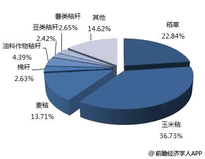 從品種上看,稻草約為2.5億噸,占理論資源量的22.89%;麥秸為1.9億噸,占17.31%;玉米秸為4.02億噸,占36.78%;棉稈為2879萬噸,占2.63%;油料作物秸稈(主要為油菜和花生)為4806萬噸,占4.39%;豆類秸稈為2649萬噸,占2.42%;薯類秸稈為2901萬噸,占2.65%。