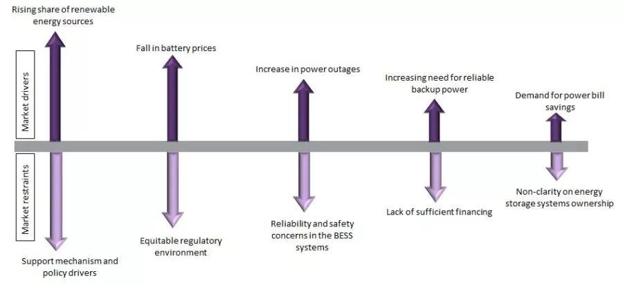 另一方面,電池儲能系統(tǒng)市場正面臨幾項挑戰(zhàn)。例如,合理監(jiān)管環(huán)境的缺失延緩了電池儲能系統(tǒng)項目的發(fā)展。電池儲能系統(tǒng)市場決定于于體制監(jiān)管障礙減少以及公私部門合作的鼓勵政策。目前沒有儲能設(shè)備通用的標(biāo)準(zhǔn)文件,因此每個制造商都可以自由開發(fā)各自的內(nèi)部標(biāo)準(zhǔn),這導(dǎo)致系統(tǒng)在安裝和維護過程中存在兼容性問題。使用這種在不同公司技術(shù)和制造水平生產(chǎn)的唯一或者定制的備用件,會造成延緩整個工業(yè)經(jīng)濟規(guī)模的影響。應(yīng)制定可促進儲能技術(shù)的國家標(biāo)準(zhǔn),以加強儲能滲透。這也有利于國家電力提高穩(wěn)定性和可靠性的解決方案。同時,電池儲能系統(tǒng)的可靠性和安全性問題、缺乏足夠資金、支持機制和政策驅(qū)動的缺失、以及儲能系統(tǒng)所有權(quán)的不明晰,都將是未來一段時間內(nèi)阻礙電池儲能系統(tǒng)快速增長的一些因素。