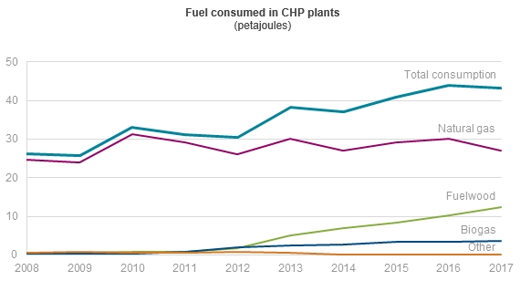 2017年,拉脫維亞熱電聯(lián)產(chǎn)電廠主要消耗天然氣(27.1焦耳(PJ))和薪材(12.4 PJ)。在2008年至2017年期間,熱電聯(lián)產(chǎn)工廠消耗的天然氣份額從94%下降到接近63%,而RES消耗的份額增長(zhǎng)了33個(gè)百分點(diǎn),2017年達(dá)到37%。
