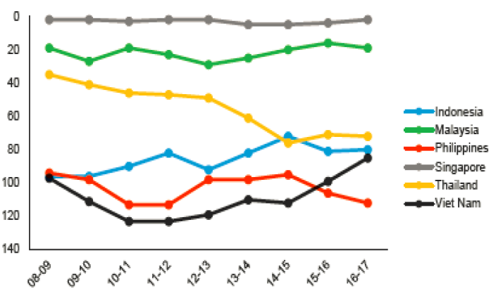 圖5:總體基礎(chǔ)設(shè)施排名,東盟-6 2008 - 2017年。來源:WEF全球競爭力報(bào)告(不同年份)