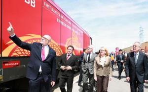 4月27日,奧地利國家鐵路總公司總裁安德烈斯·馬鐵(左一)陪同奧地利總統(tǒng)范德貝倫(前右一)等嘉賓一同視察剛剛抵達的成都-維也納中歐班列。(圖片來源:新華社 潘旭攝)首列直達奧...